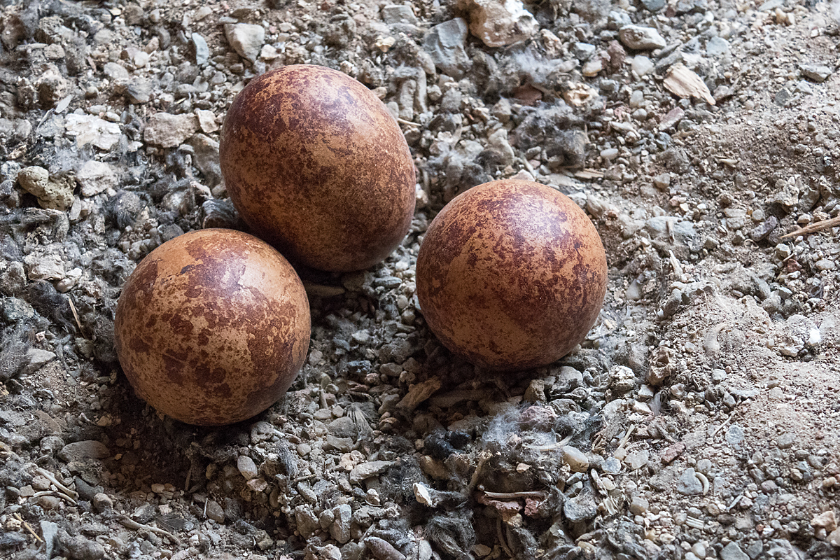Die Eier sind recht rundlich, messen im Mittel etwa 51 × 41 mm und wiegen 39-48 g. Sie sind auf gelblichem
